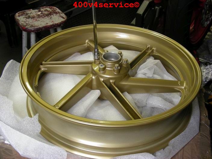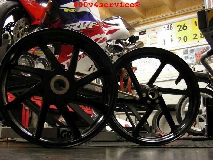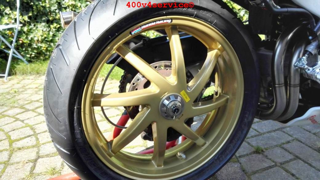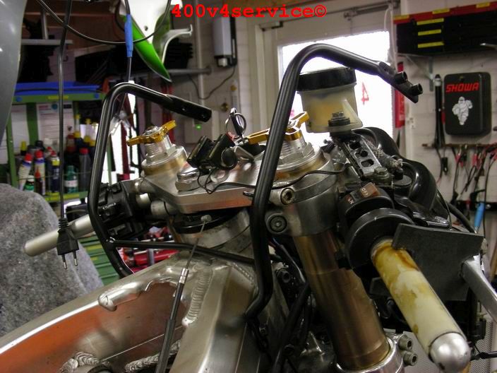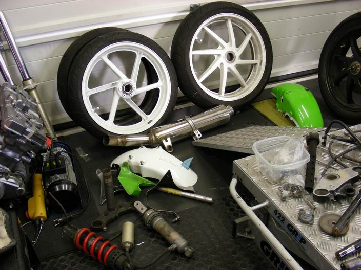 Het wachten is nu op de terugkeer van de "gouden"wielen. Ook moet de nieuwe radiateurset nog binnenkomen evenals een op maat gemaakte gaskabelset ( trek en duw). Dunlopad raceremblokken voor de kawa remklauwen. Wat zal dat remmen op de 310 mm remschijven!!!.