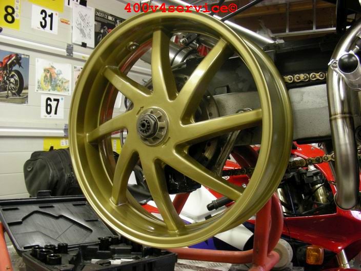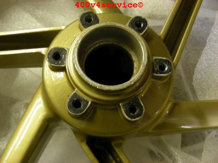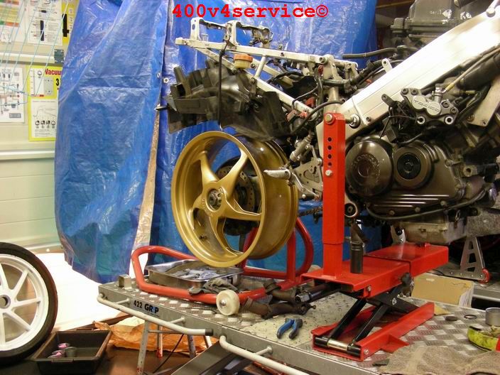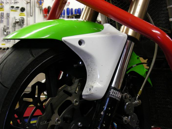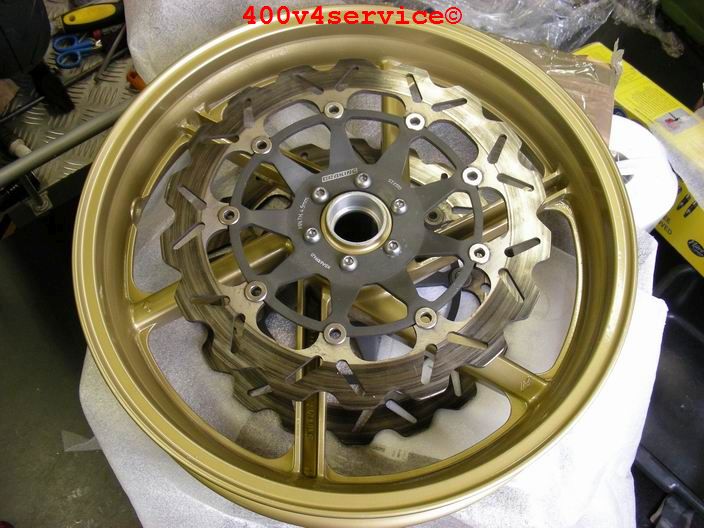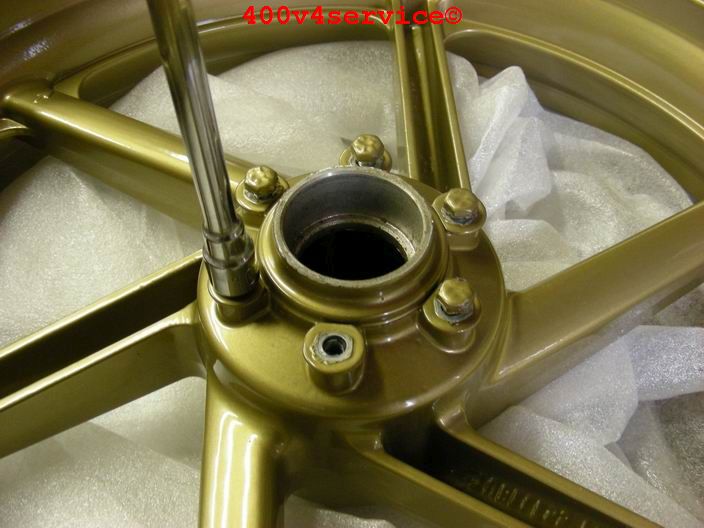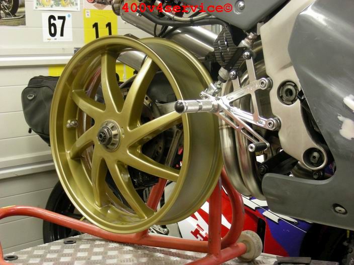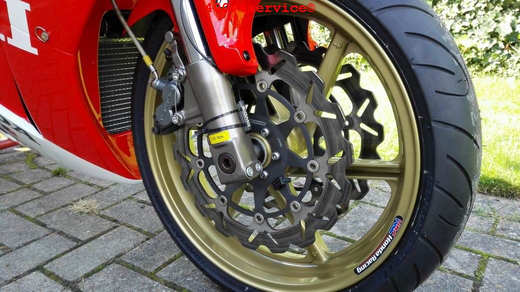 Overigens wordt gewoon gebruik gemaakt van het originele Honda voorwiel, met de Kawa voorwielas. ( aangepaste afstandsbusjes).