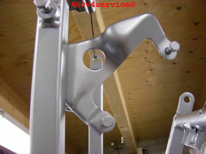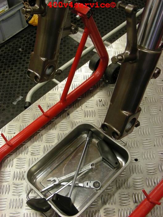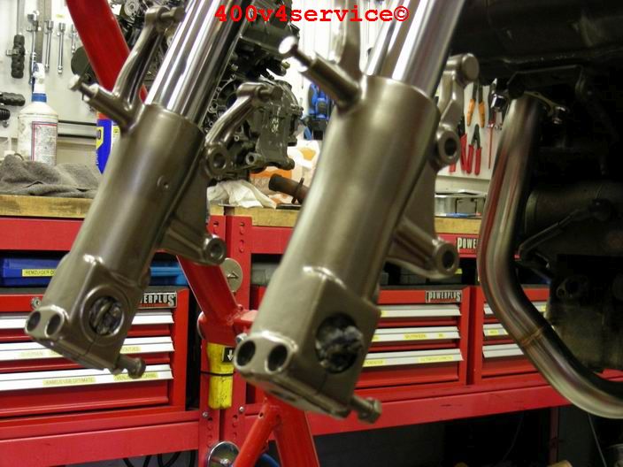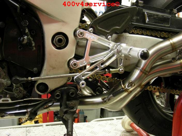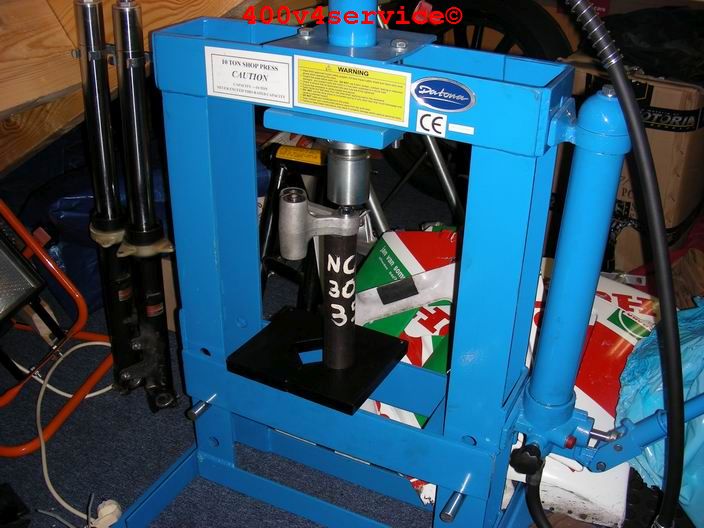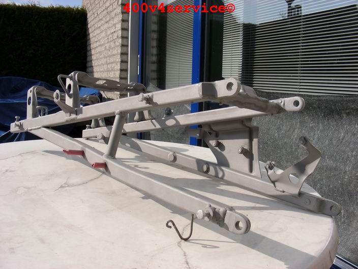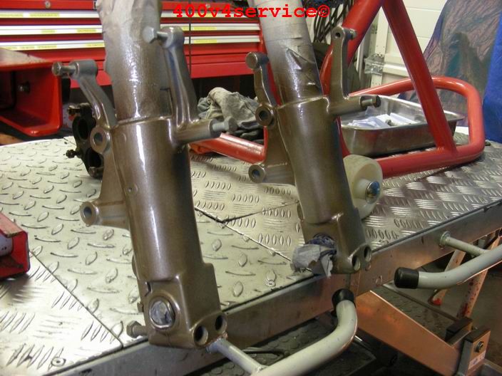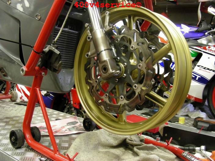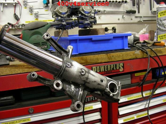 Volgende stap: aanpassen linksysteem en spuiten onderpoten . Er zit een USD in van een ZXR 400. Hiervoor is een aanpassing van het bovenste balhoofdlager nodig. Hiervoor is een speciaal adapter/pasring gedraaid. Braking Waveschijven van een RC30. (310 mm). Dat remt als een malle!!!, mede door de Dunlopad race-remblokken.