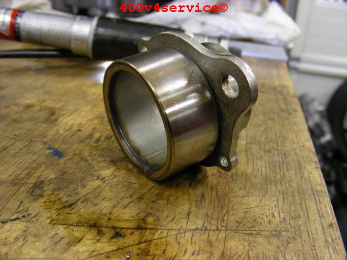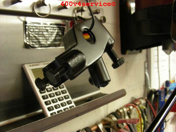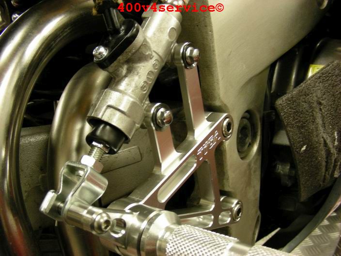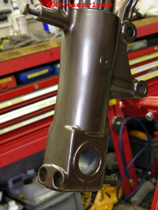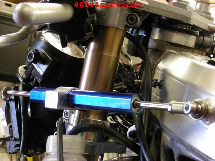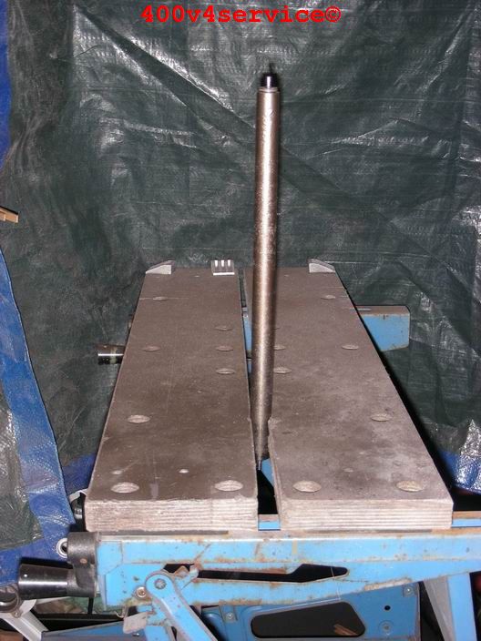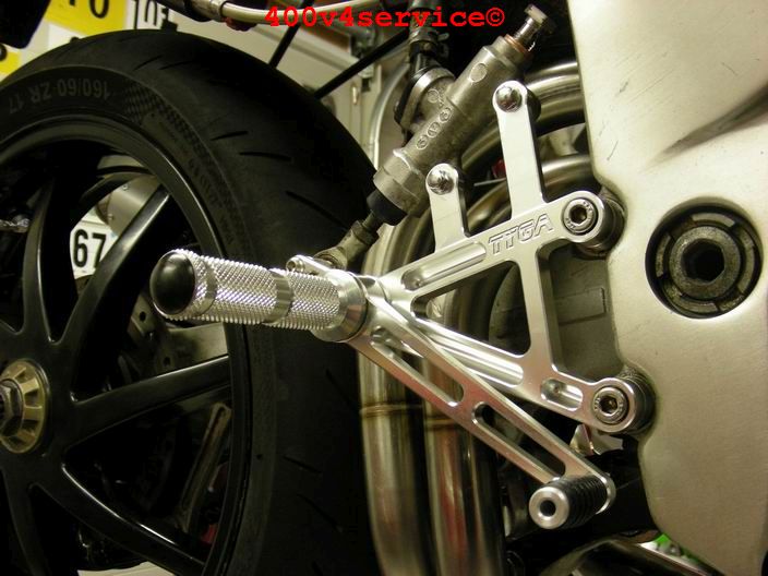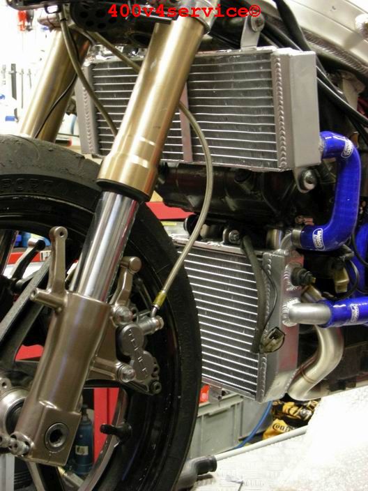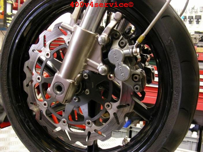 Volgende stap: aanpassen linksysteem en spuiten onderpoten . Er zit een USD in van een ZXR 400. Hiervoor is een aanpassing van het bovenste balhoofdlager nodig. Hiervoor is een speciaal adapter/pasring gedraaid. Braking Waveschijven van een RC30. (310 mm). Dat remt als een malle!!!, mede door de Dunlopad race-remblokken.