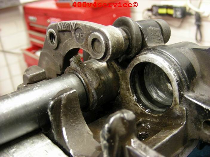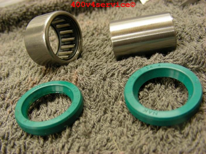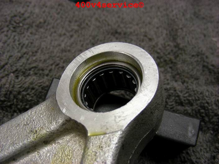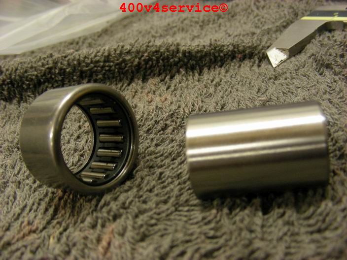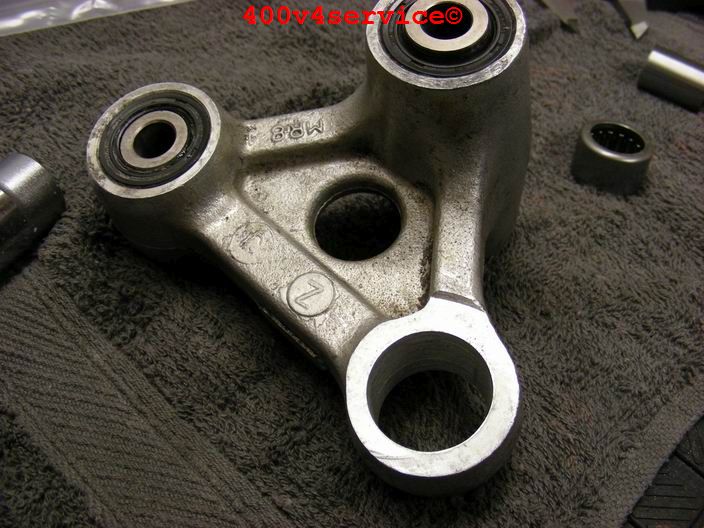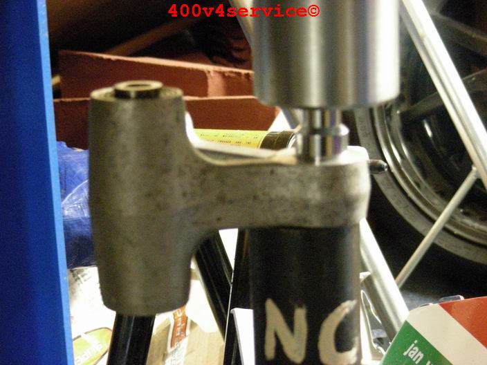Verder heb ik ook het linksysteem aangepakt. De NC30 heeft naaldlagertjes, behalve bovenin. Daar zit een bus met rubber. Daar komt dus ook een naaldlagertje wat voor een beter en fijner aanspreken van de vering zorgt. Het gat moet worden opgeboord naar 24 mm.