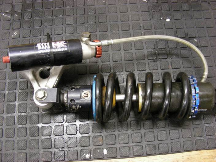 De achterschokdemper komt van een Aprilia 250RS. Heeft zowel ingaande als uitgaande demping en ook hoogteverstelling. De lengte van deze demper is 9 mm meer dan de standaard NC30. Het linksysteem heeft een verhouding van 1:3 zodat in dit geval de achterzijde van de motor 27 mm hoger staat. Is volledig onder handen genomen door HK suspension.