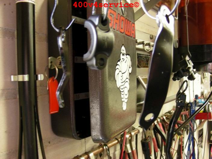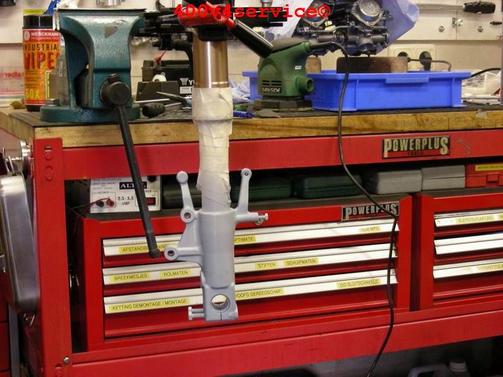 De spuitwerk van de ZXR 400 voorvork is klaar. Spuitcabine en vorktool weer opgeruimd:
