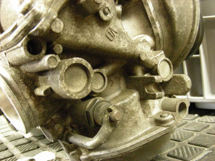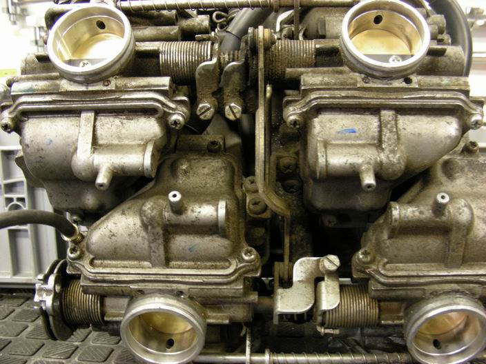 De carburateurszijn zowel van buiten als (blijkt later) ook van binnen behoorlijk vies. Tijd om ze eens grondig te reinigen. Dan zijn ze straks weer perfect af te stellen.