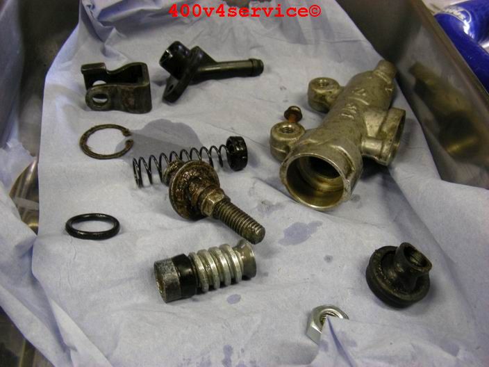 Na montage van de nieuwe remleiding bleek de pomp niet fijn te functioneren. Bleef hangen en voelde niet goed aan. Dan is er maar één oplossing: de remcilinder demonteren en reviseren.