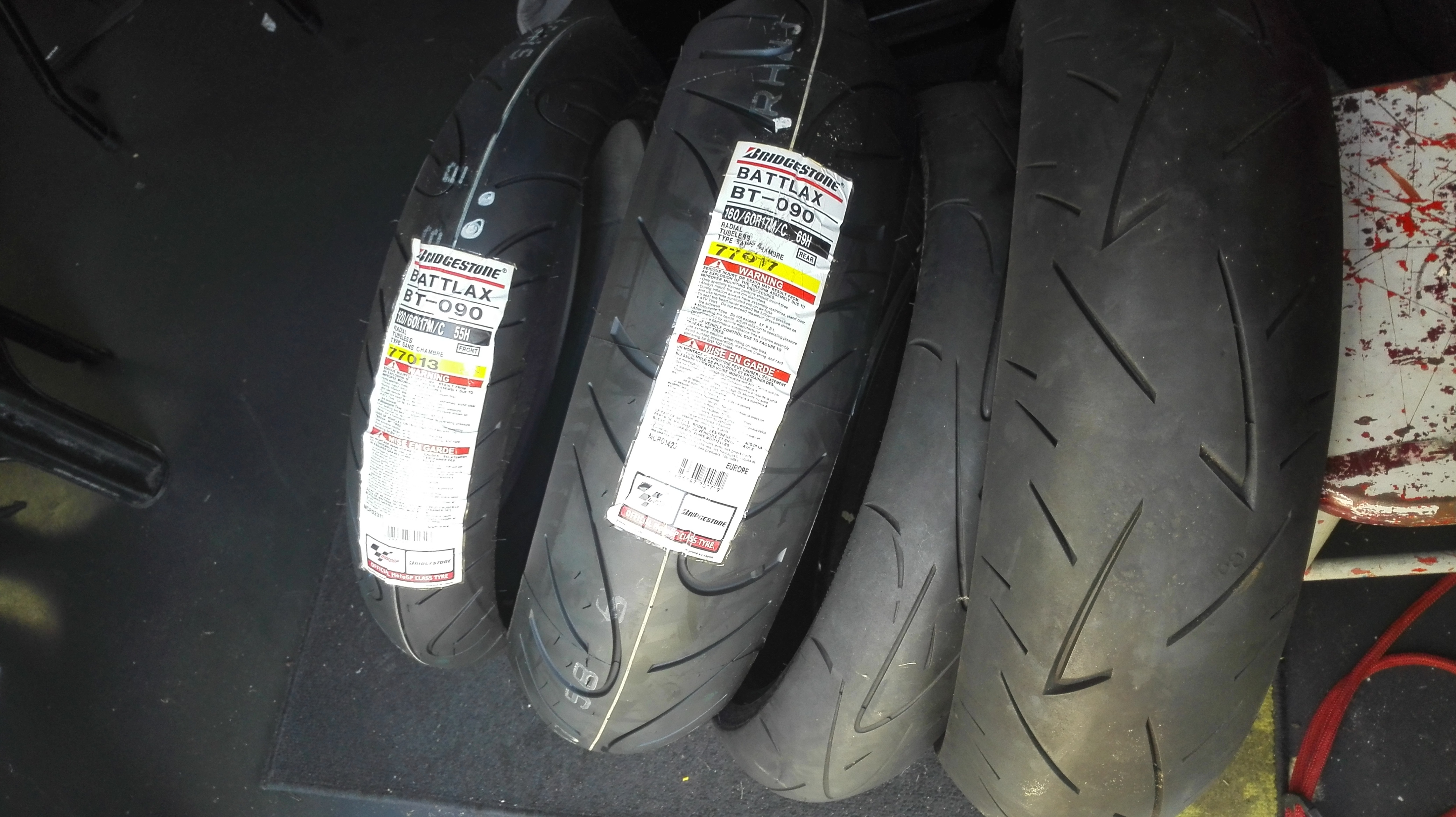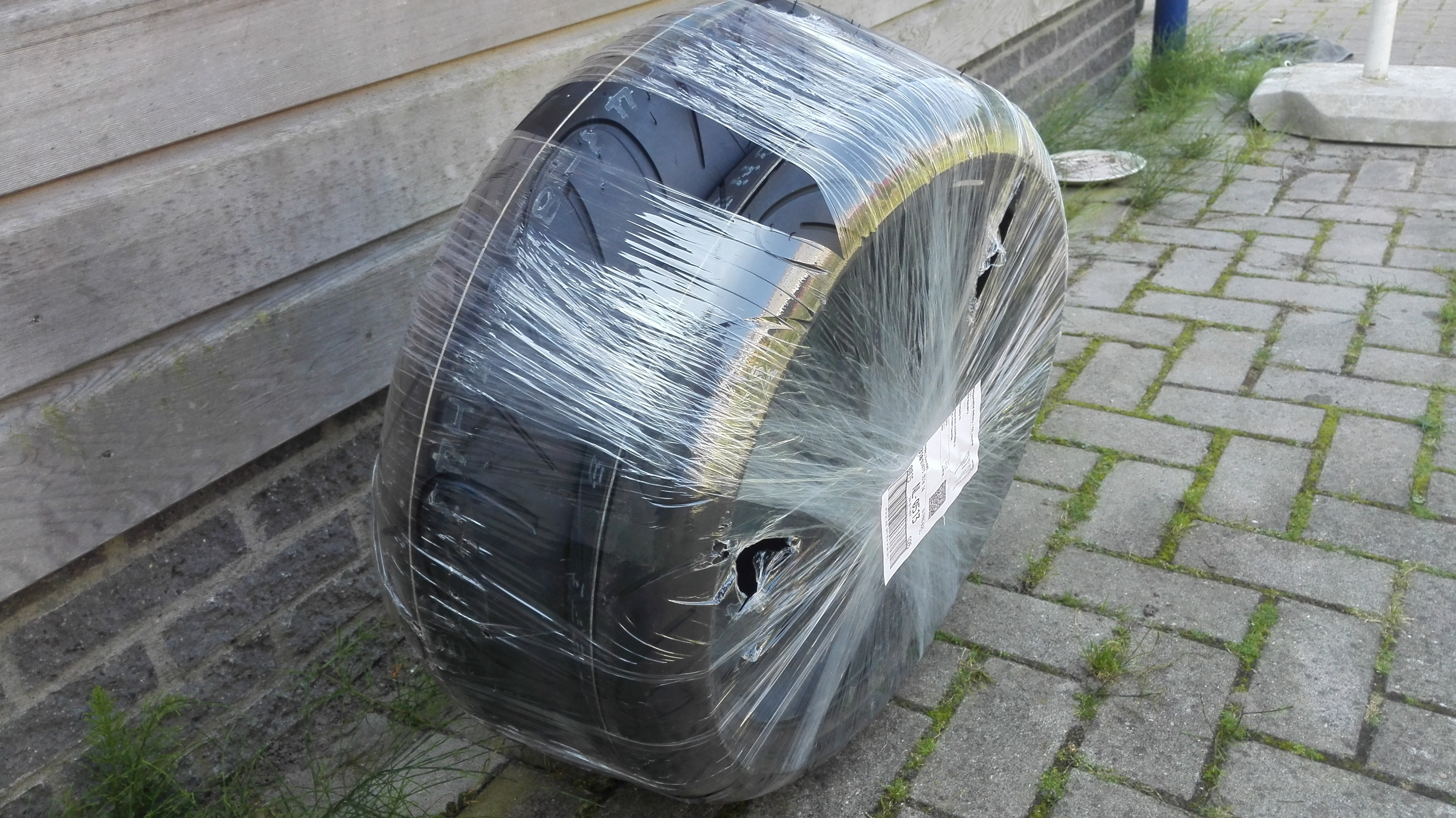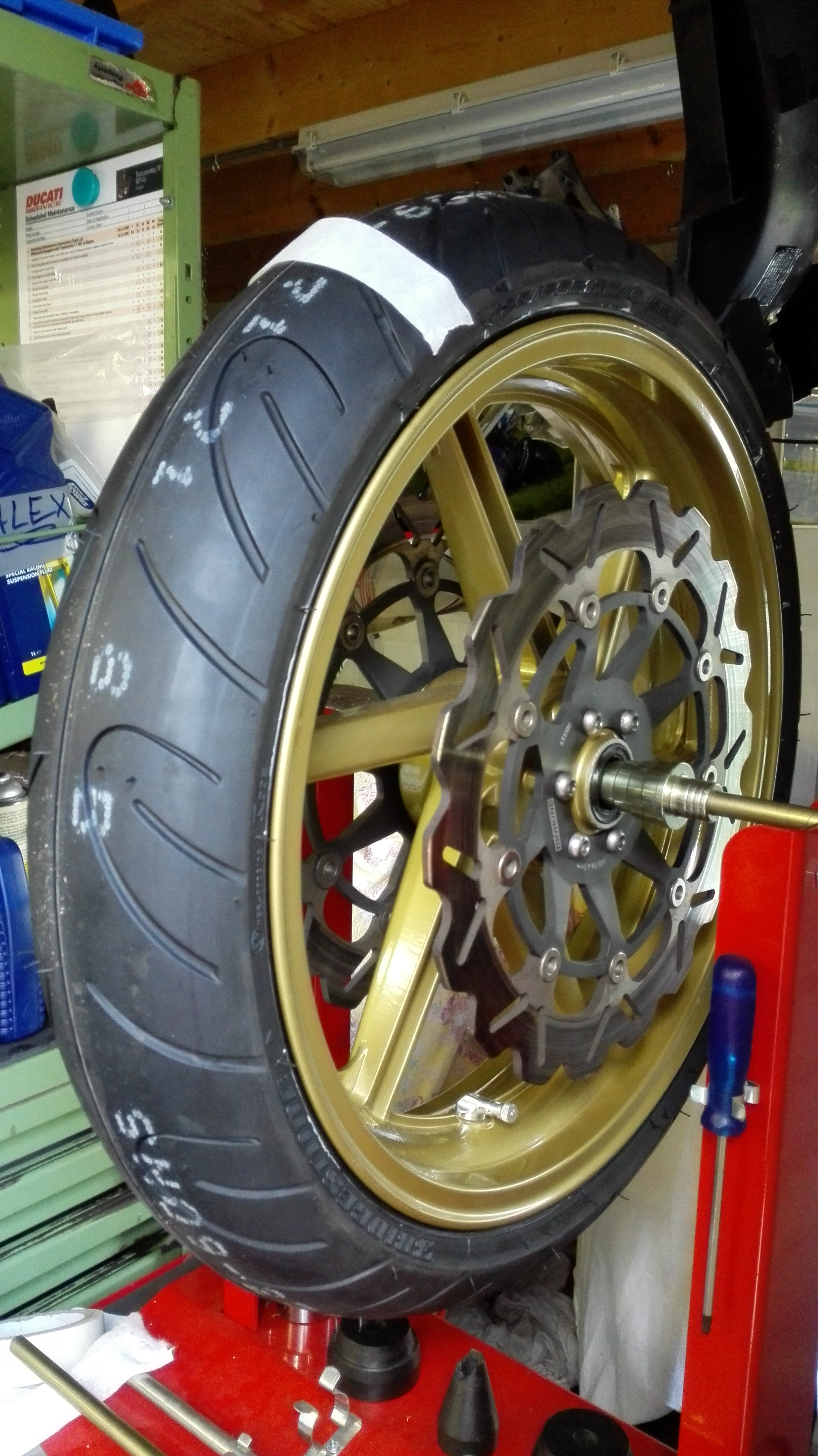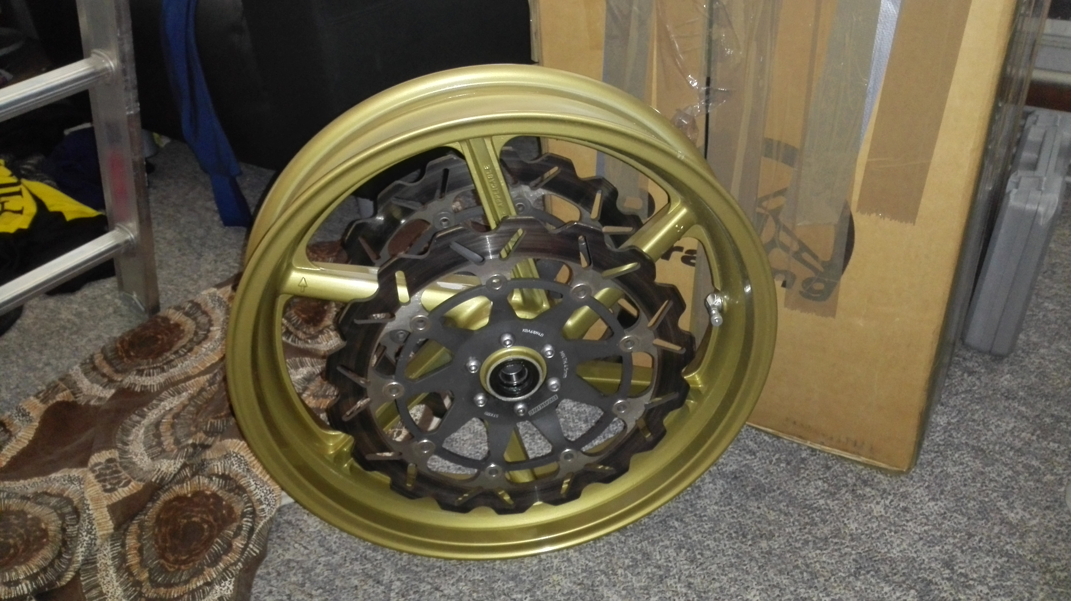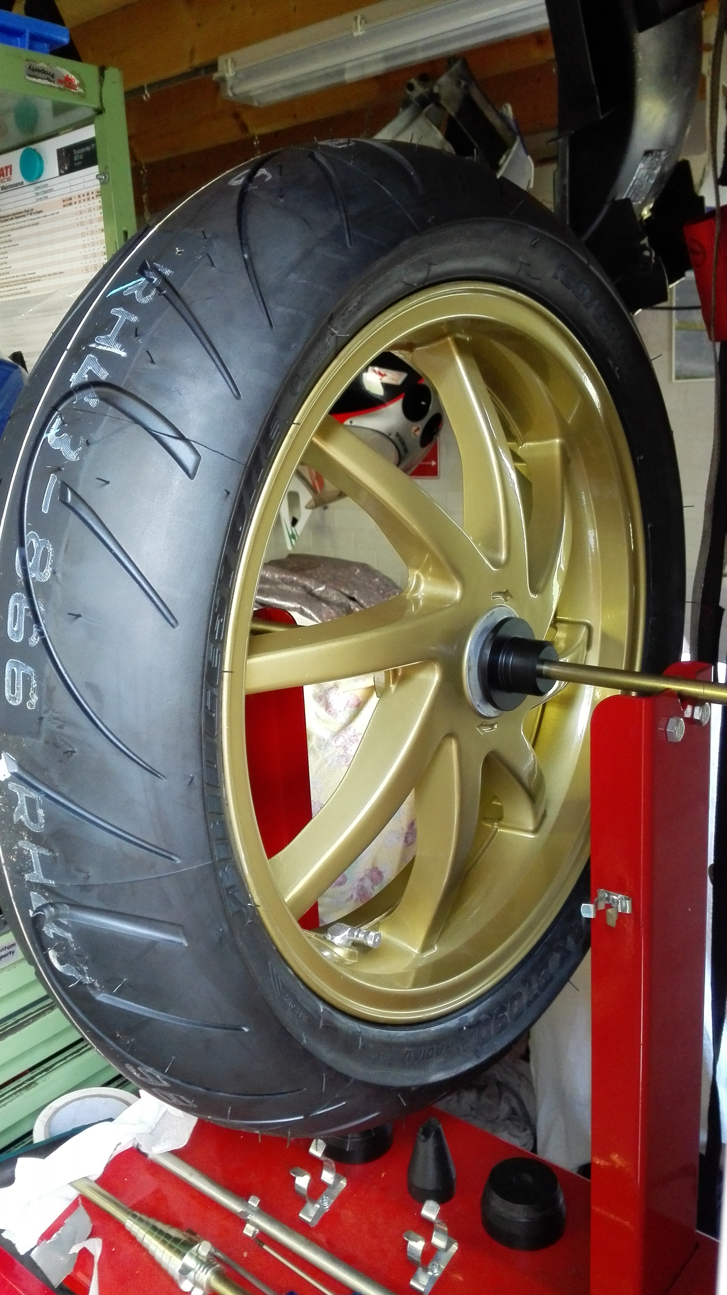 Ook de nieuwe bandenset ligt al te wachten om om de gouden velgen gemonteerd te worden.